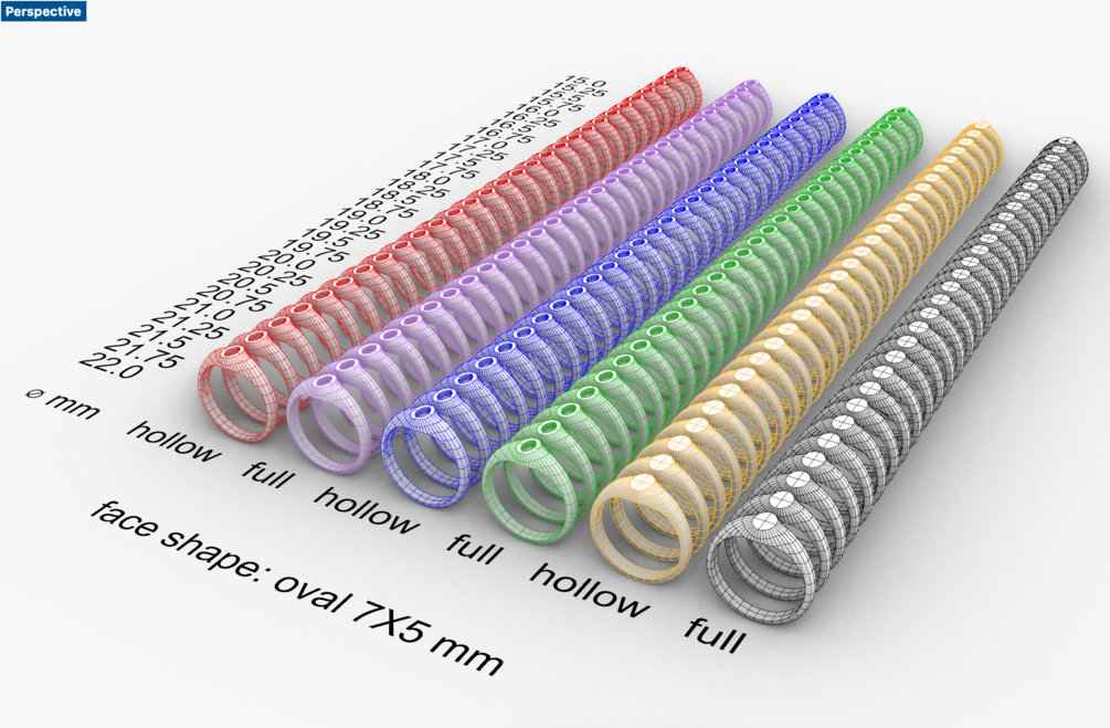 Oval Top Signet Rings: 174 items in one .3dm file (Rhino3D file format). Ring sizes in mm from 15 to 22 with a step of 0.25. Oval face: 7 x 5 mm.