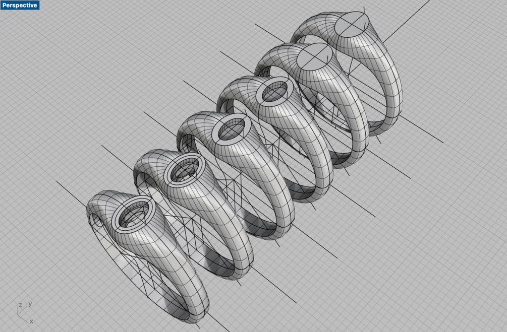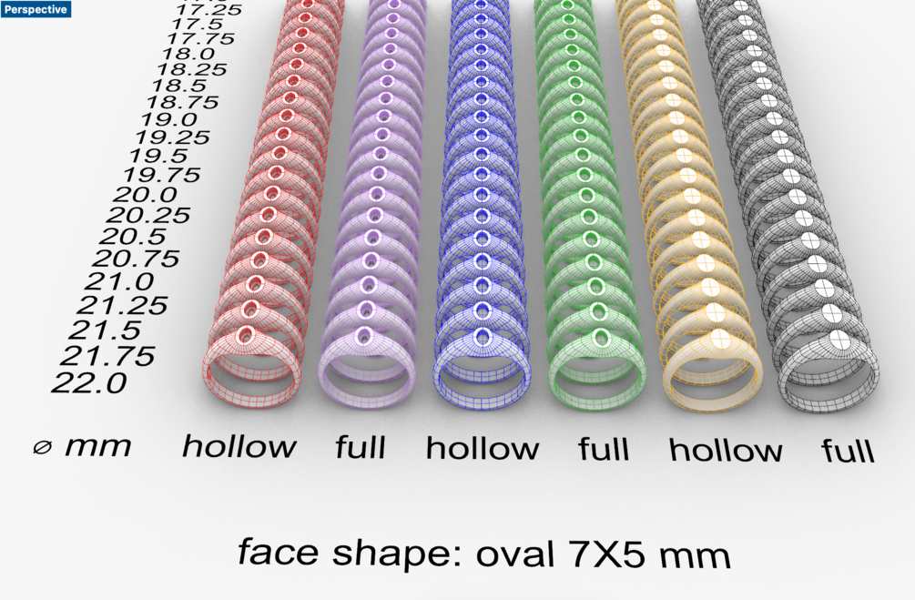 Oval Top Signet Rings: 174 items in one .3dm file (Rhino3D file format). Ring sizes in mm from 15 to 22 with a step of 0.25. Oval face: 7 x 5 mm.