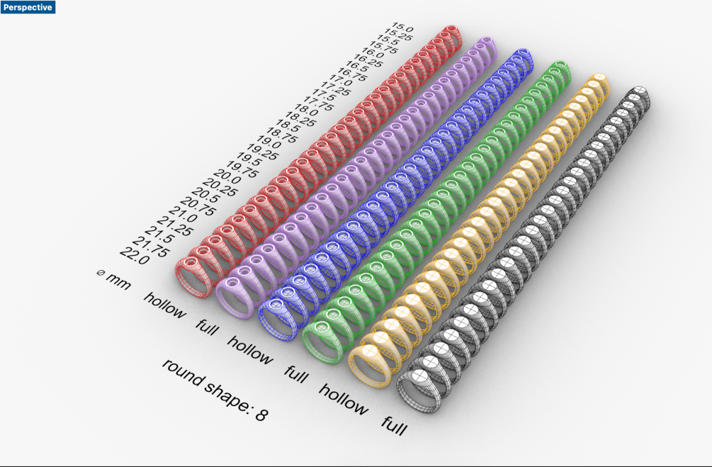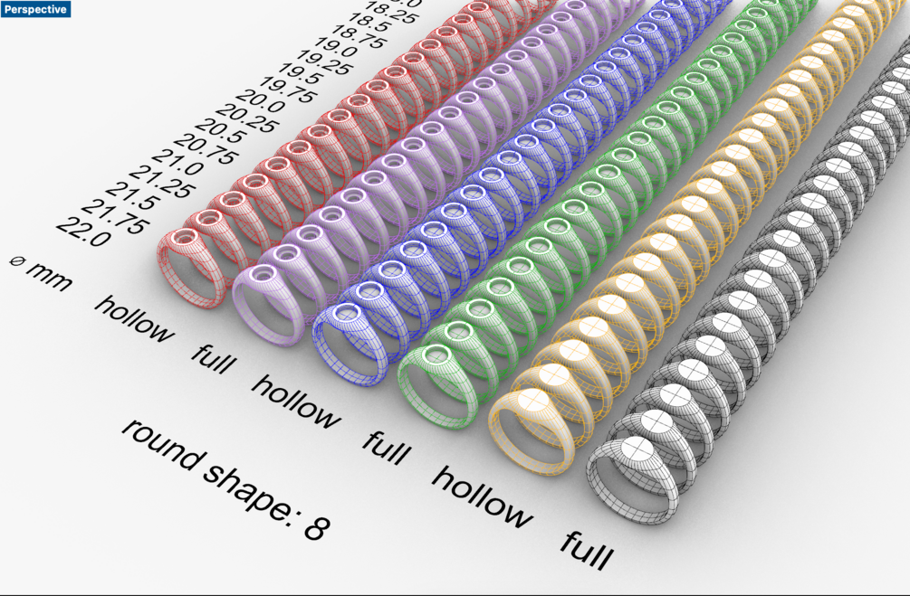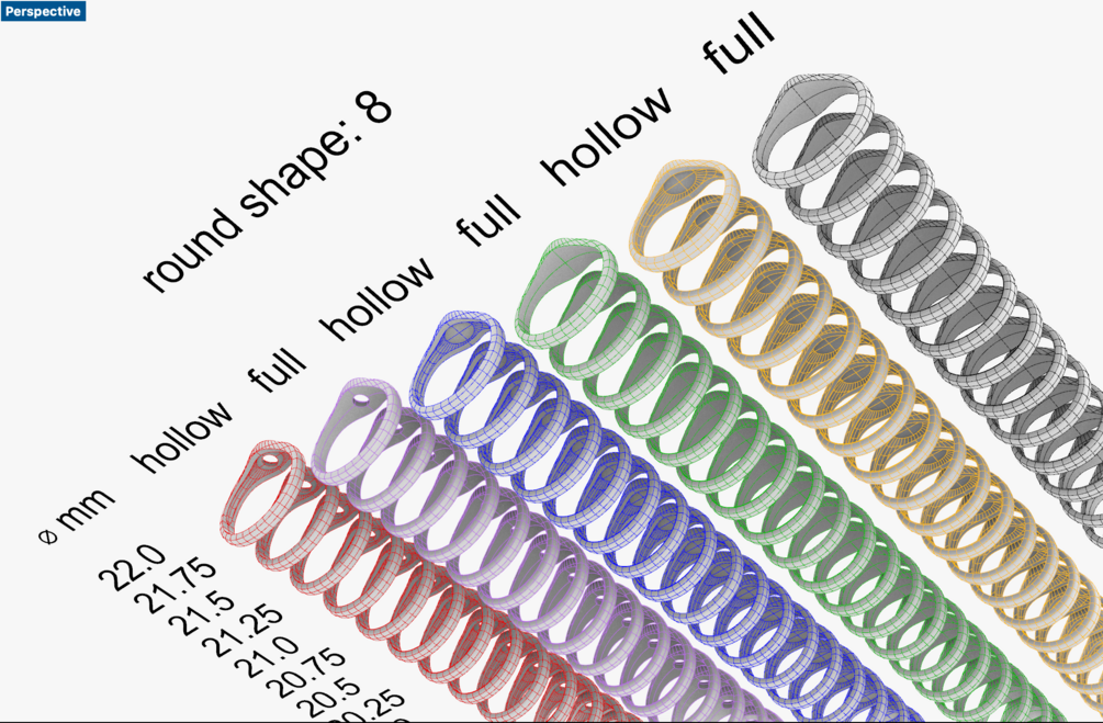 Round Signet Rings: 174 items in one .3dm file (Rhino3D file format). Ring sizes in mm from 15 to 22 with a step of 0.25. Top diameter: 8 mm.